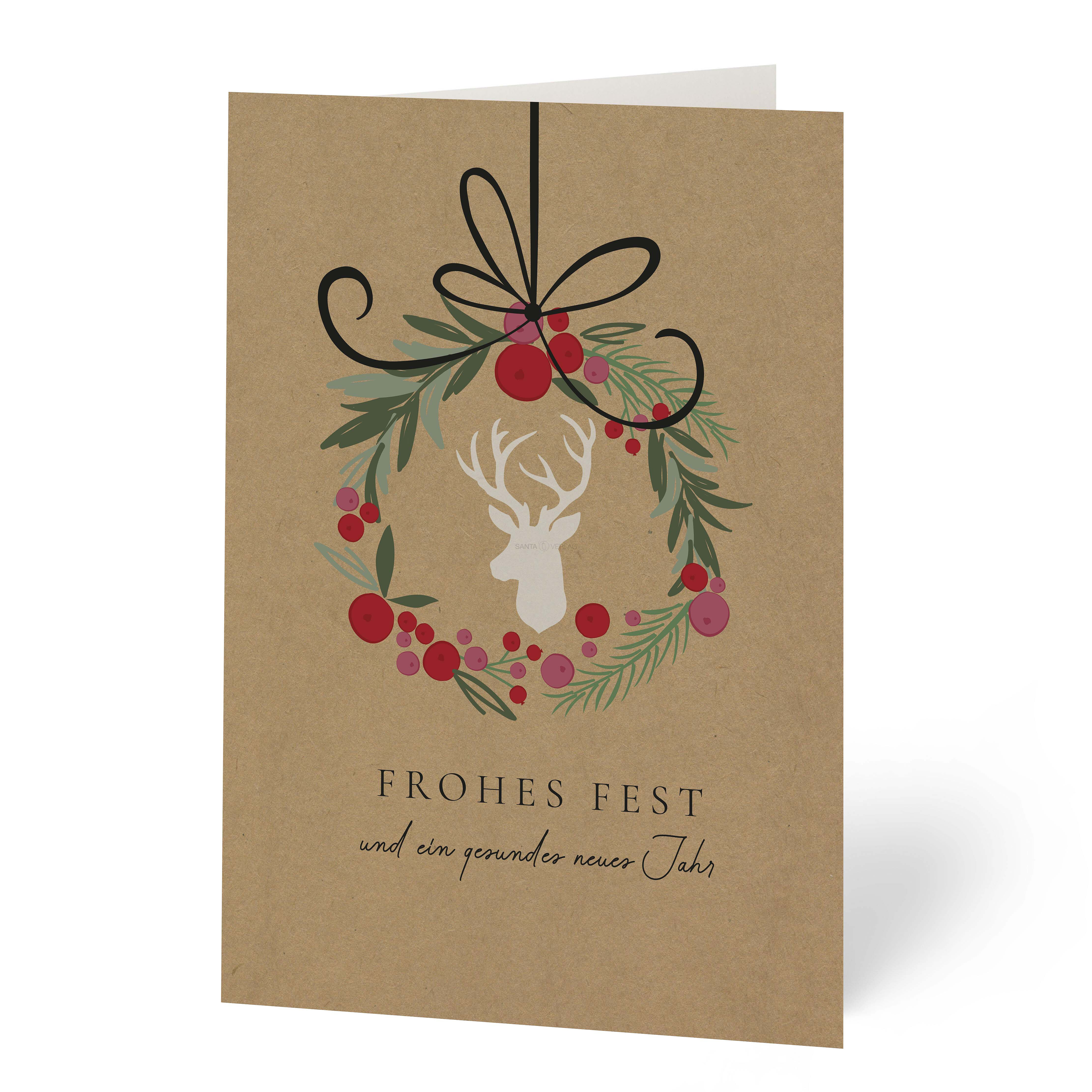 geschäftliche Designer Weihnachtskarte mit stylischem Kranz,hochwertiges Papier weiss matt, Kraftpapier-Look