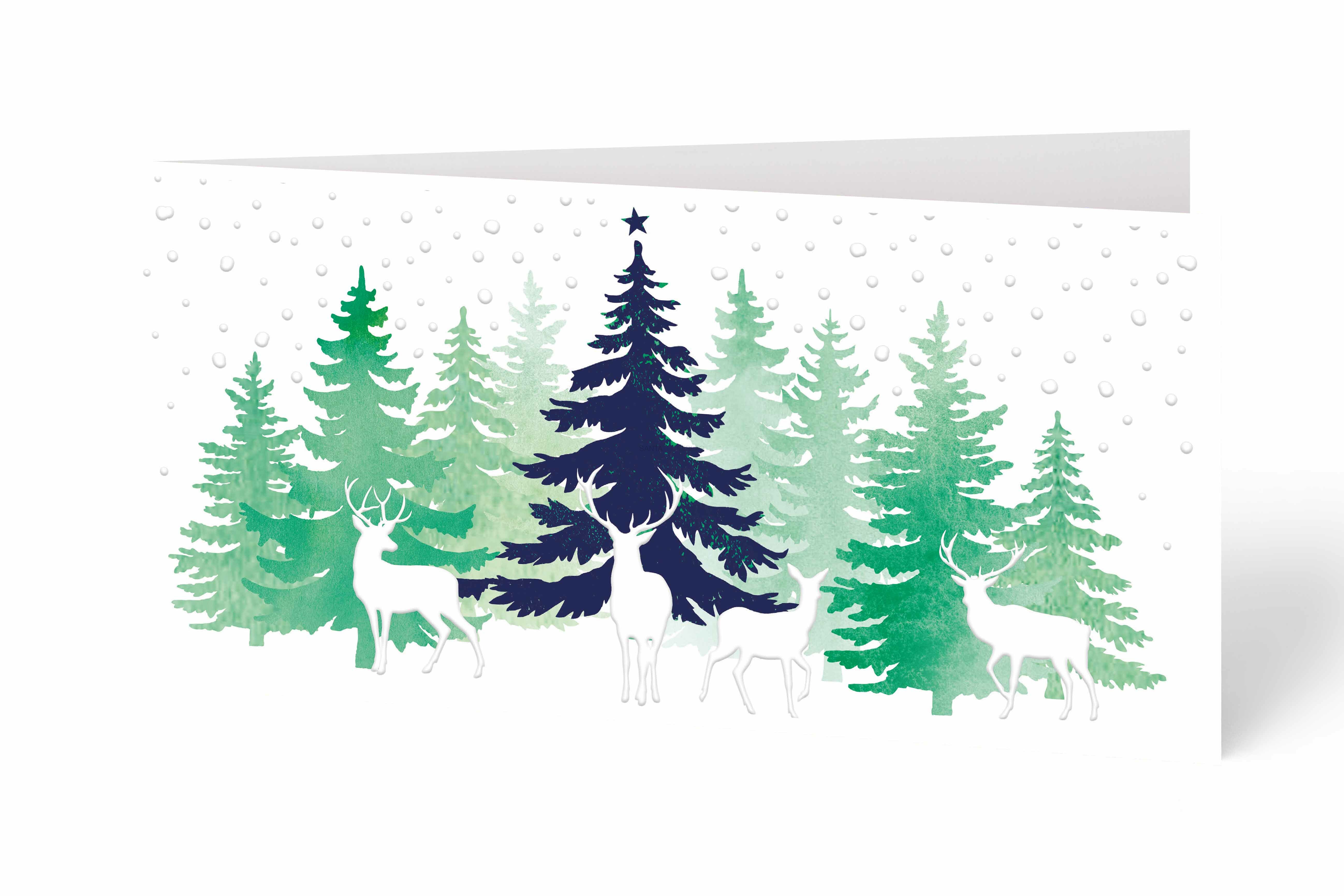 Hirsche versammeln sich im Wald, Weihnachtskarte in grün, weiss und blau