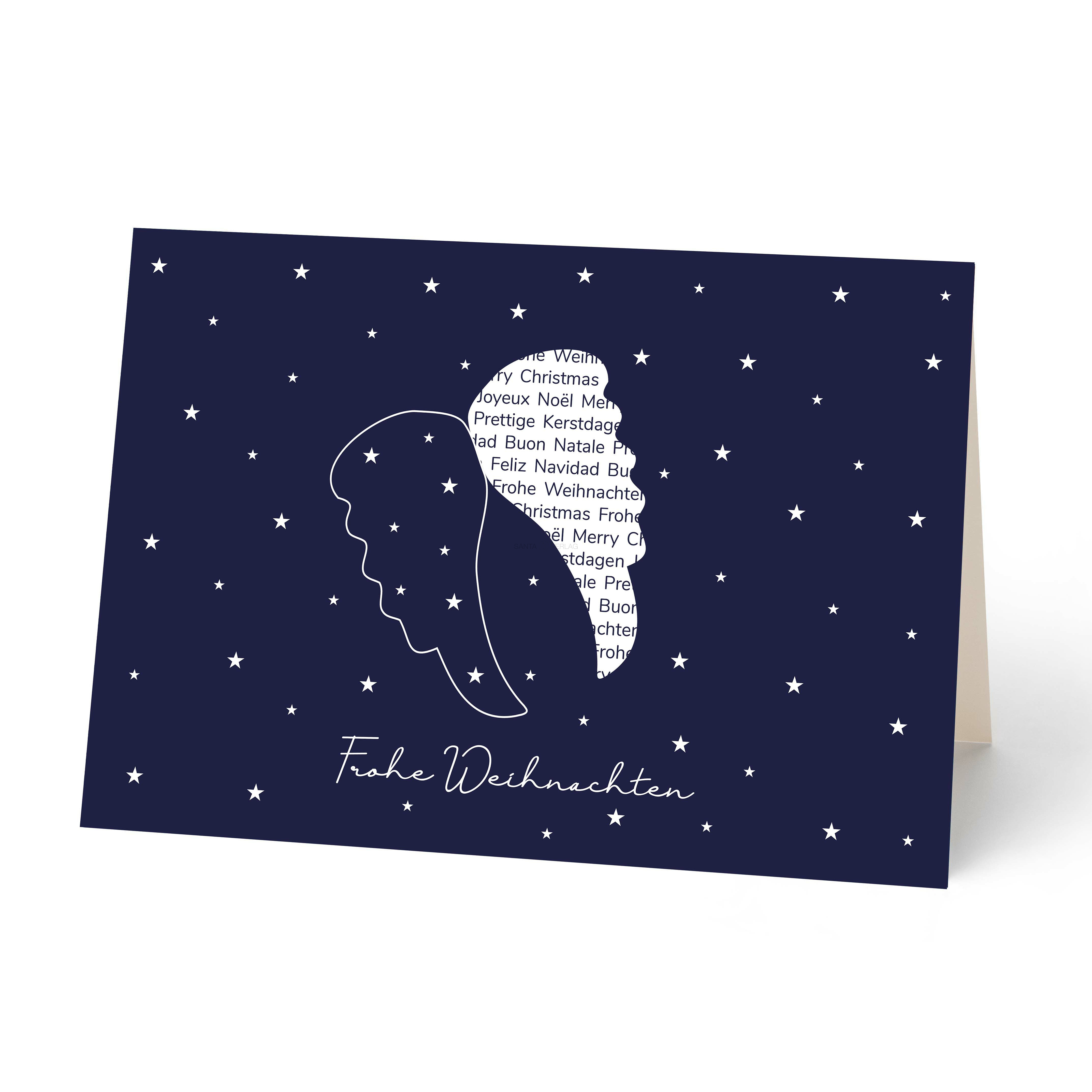 Weihnachtskarte mit internationalen Grüßen auf dem Engelflügel