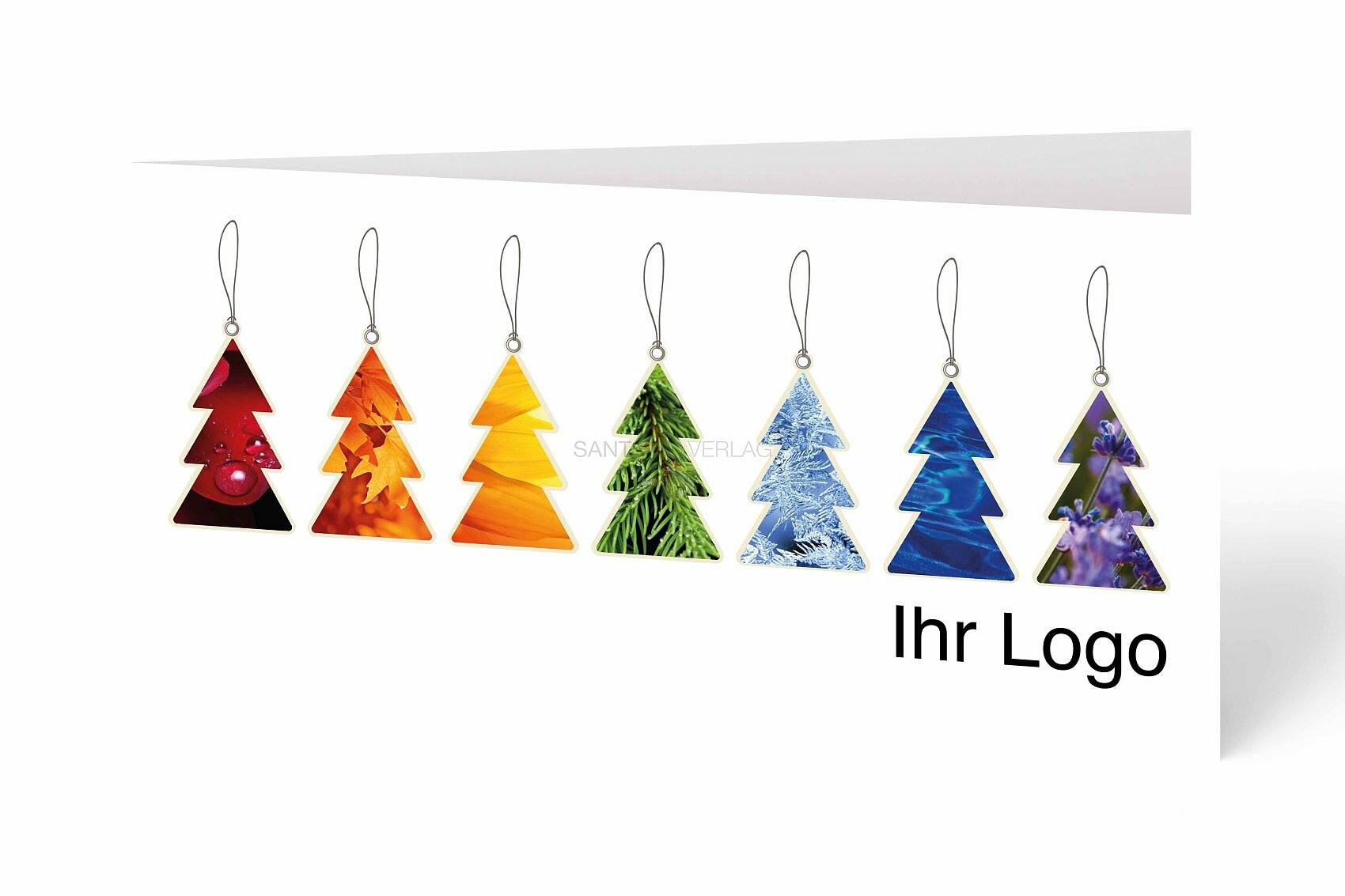 Weihnachtskarte, bunte Anhänger in Form eines Tannenbaumes, Firmenlogoaufdruck möglich