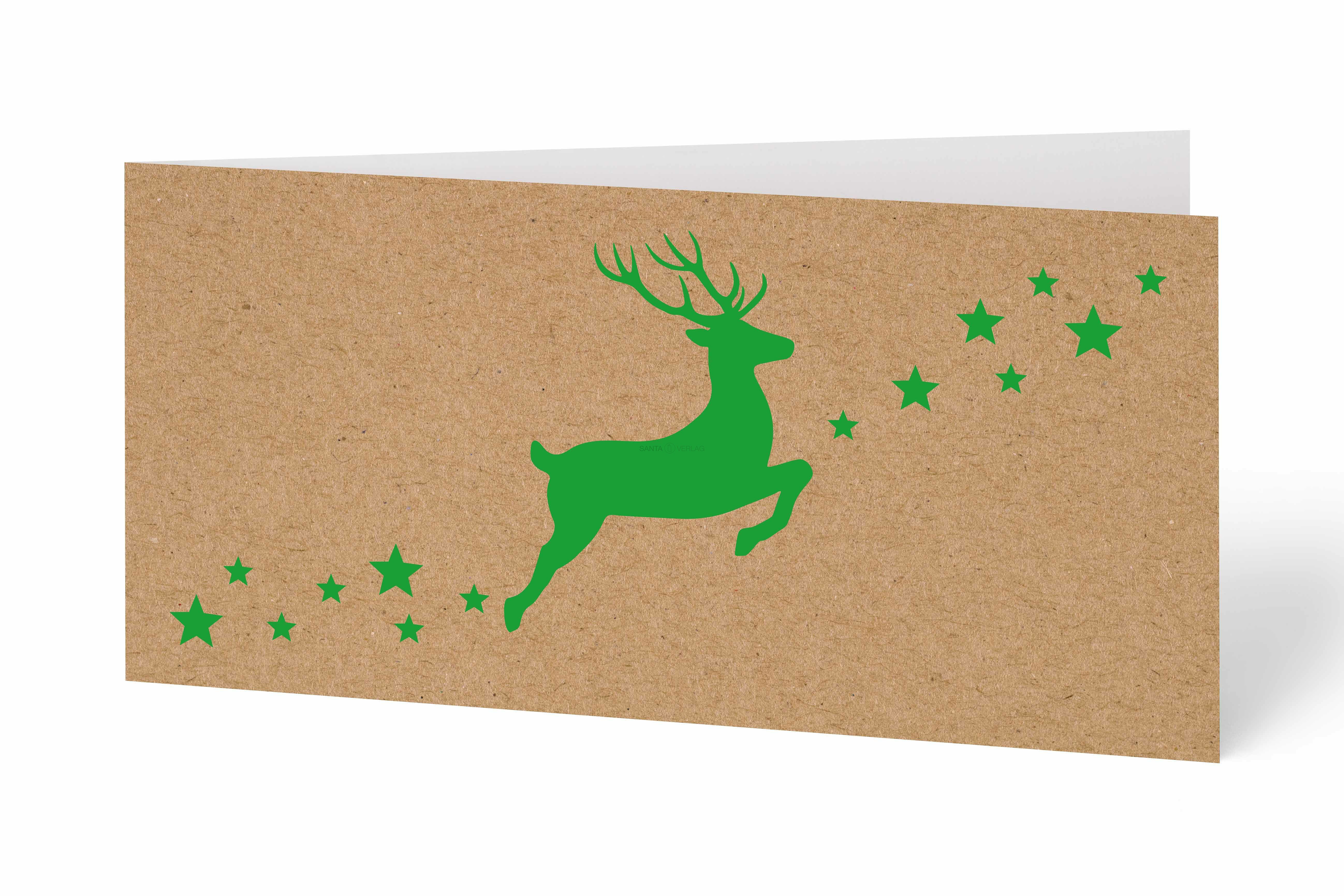 Weihnachtskarte, springender Hirsch und Sterne in grün auf naturfarbenem Hintergrund