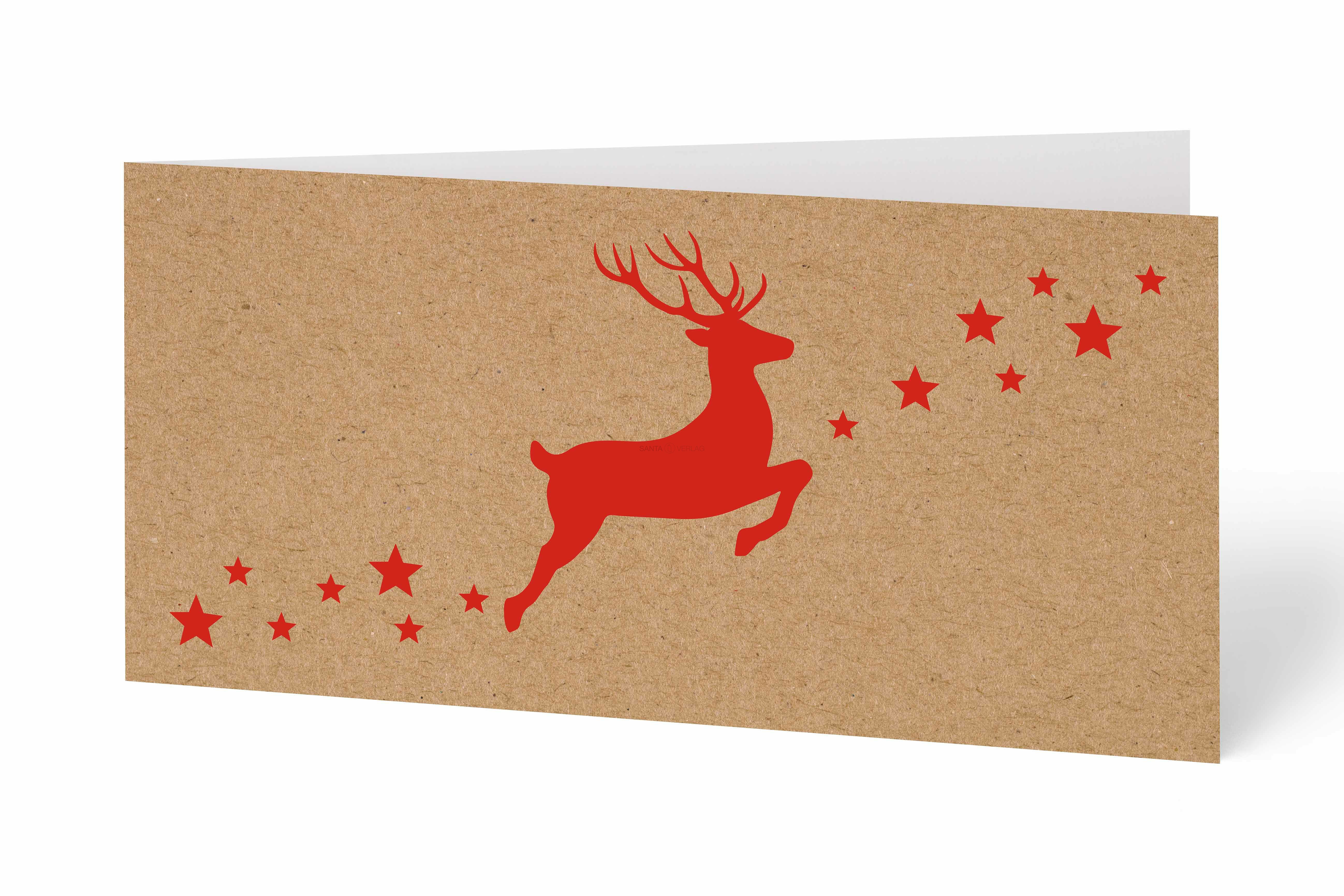 Weihnachtskarte, springender Hirsch und Sterne in rot auf naturfarbenem Hintergrund
