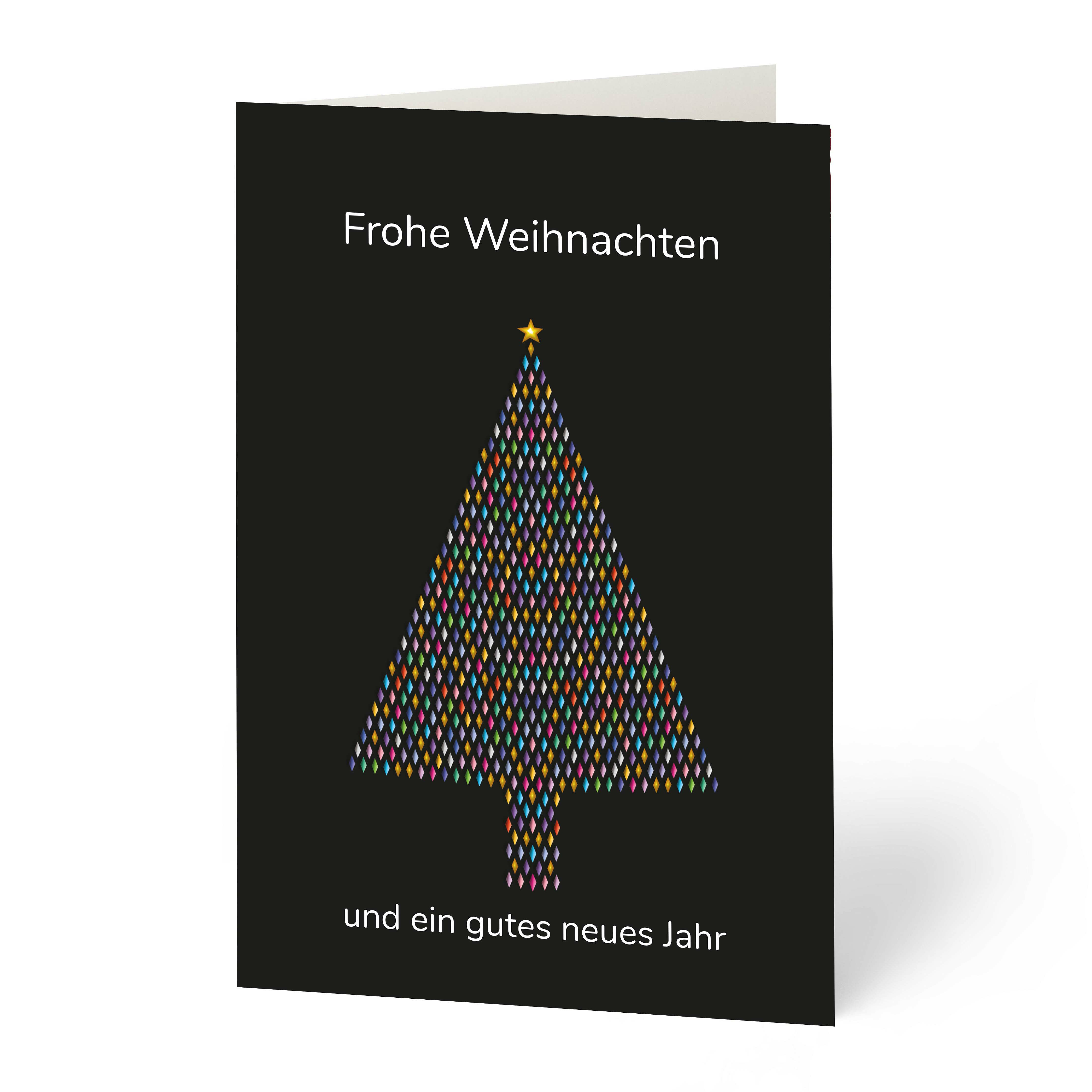 Weihnachtskarte, Weihnachts-/Neujahrskarte mit farbigem Tannenbaum auf schwarzem Hintergrund