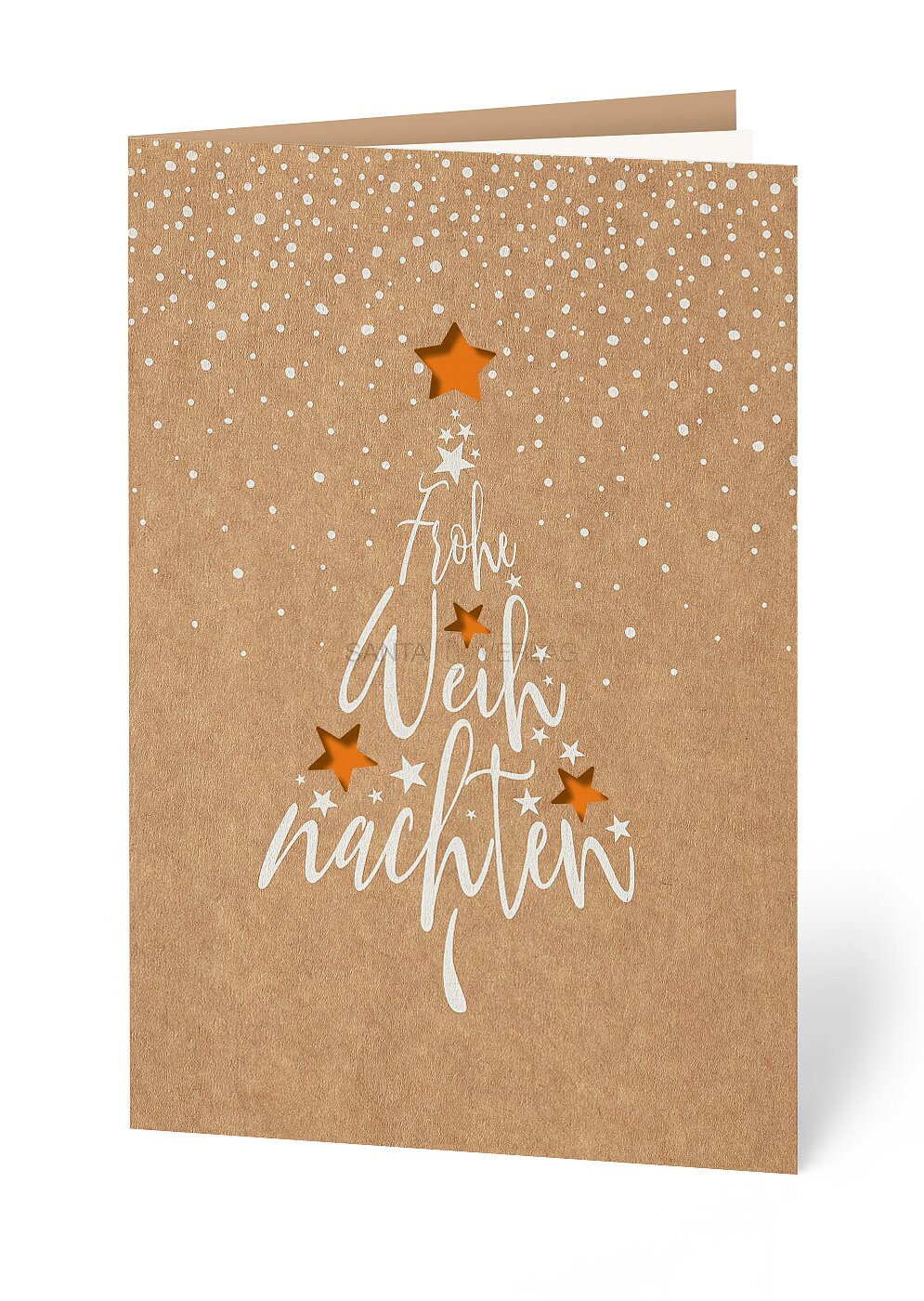 Weiße Weihnachten auf erdfarbenem Kraftkarton mit orangefarbenen Sternen sind eine warme und natürliche Art, Weihnachtsgrüße zu übermitteln.