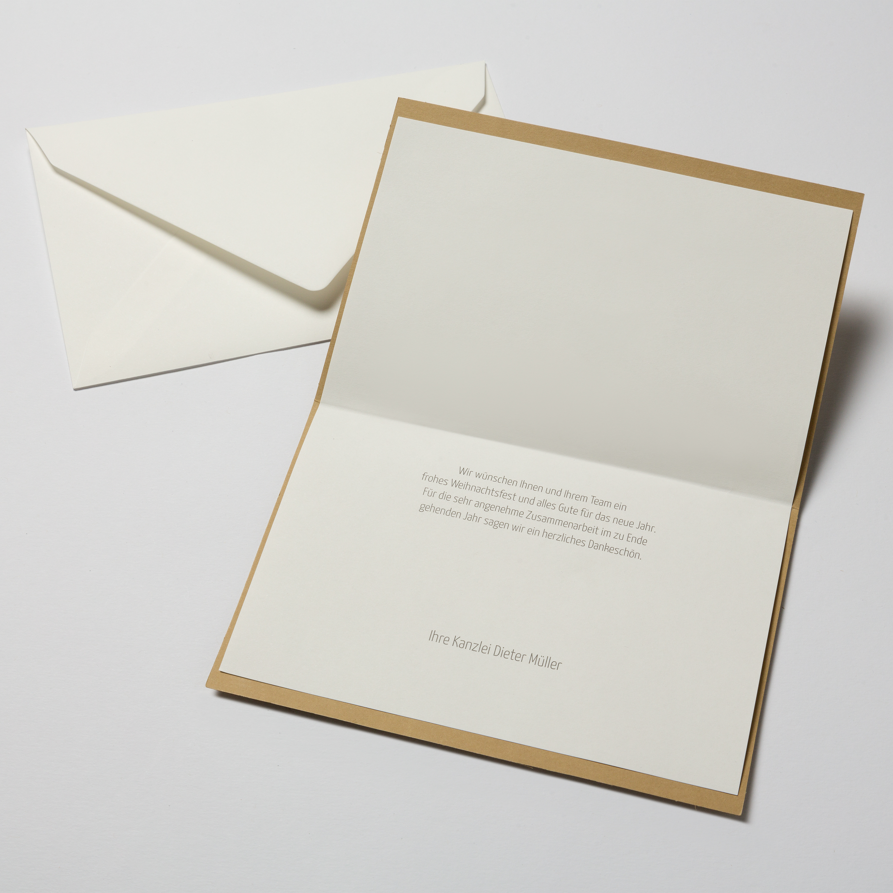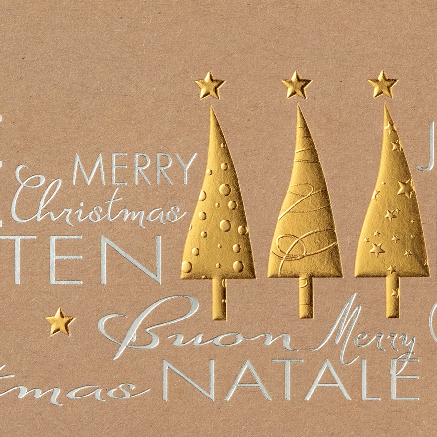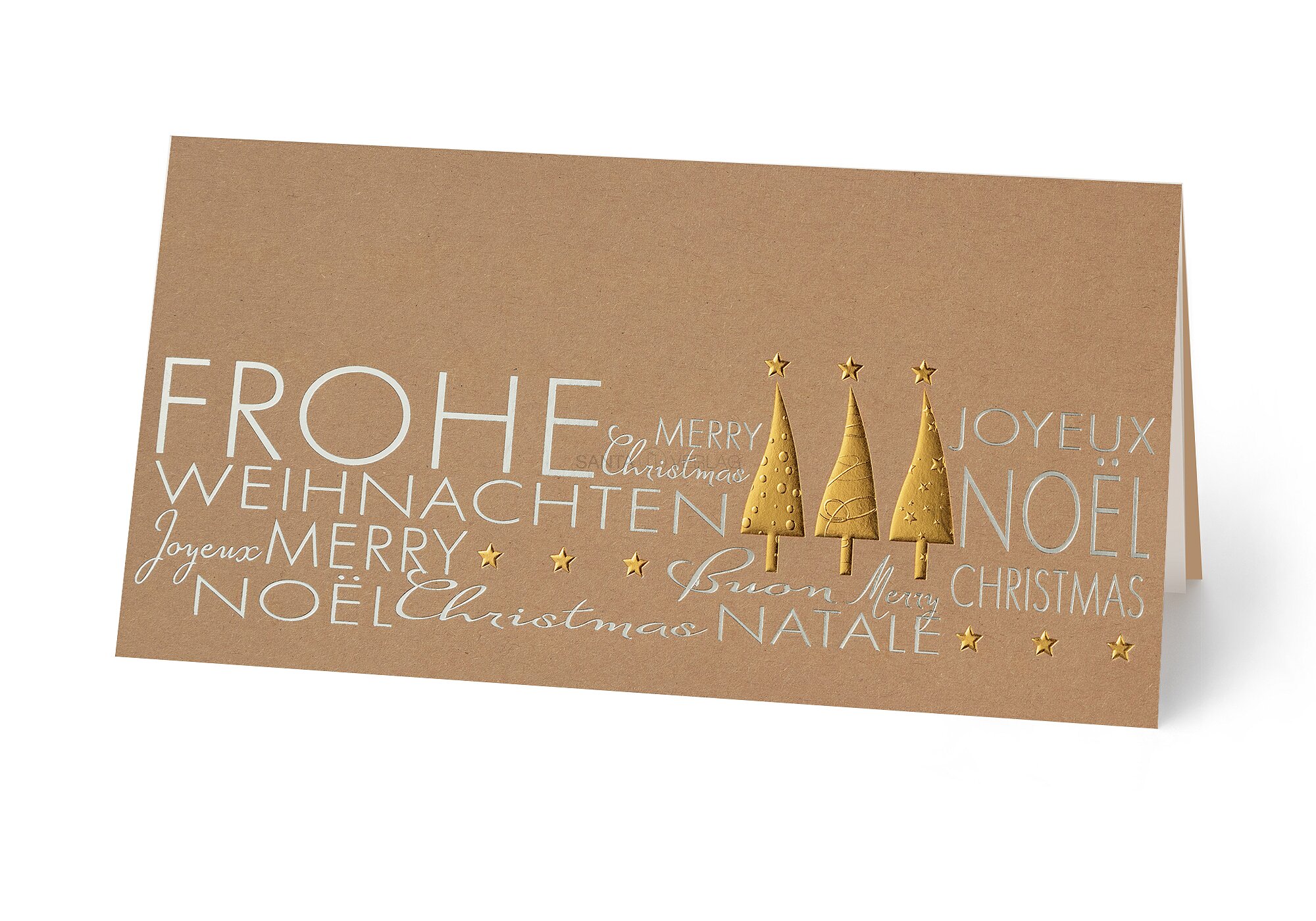 Robuster Kraftpackkarton in Kombination mit kräftiger Gold- und dezenter Weißfolienprägung harmonieren wunderbar, Weihnachtsgrüße global zu übermitteln.