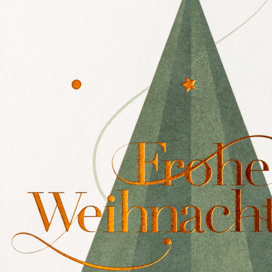 Moderne Weihnachtskarte mit internationalen Wünschen auf weißem Feinstkarton. Die kupferfarbene Prägung verleiht dieser Karte eine edle Haptik und einen glänzenden Effekt.